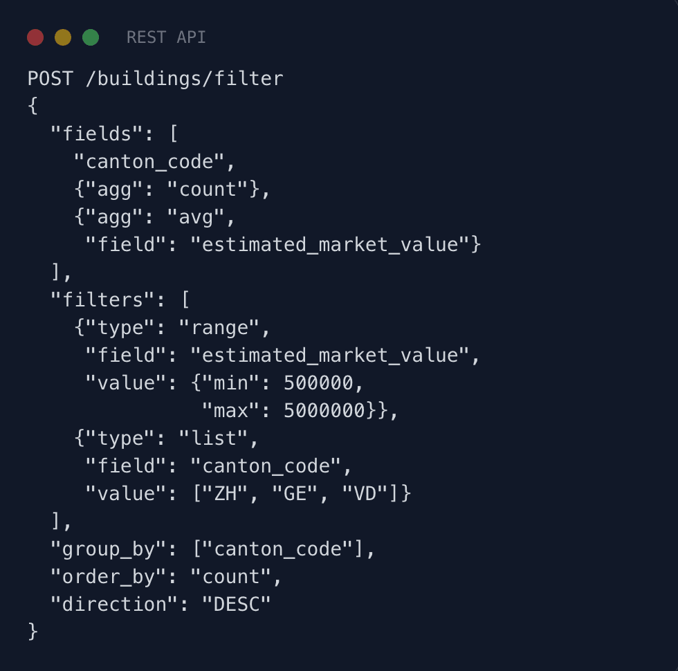 Buildings, funds, transactions, rent and price levels, ESG and more — access the entire Swiss real estate market from your own tools.